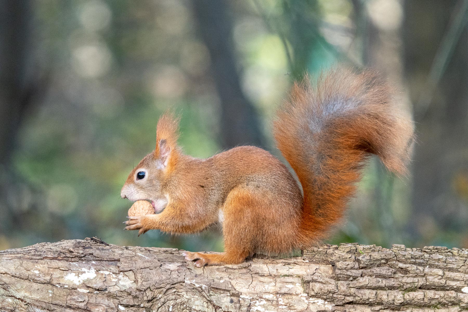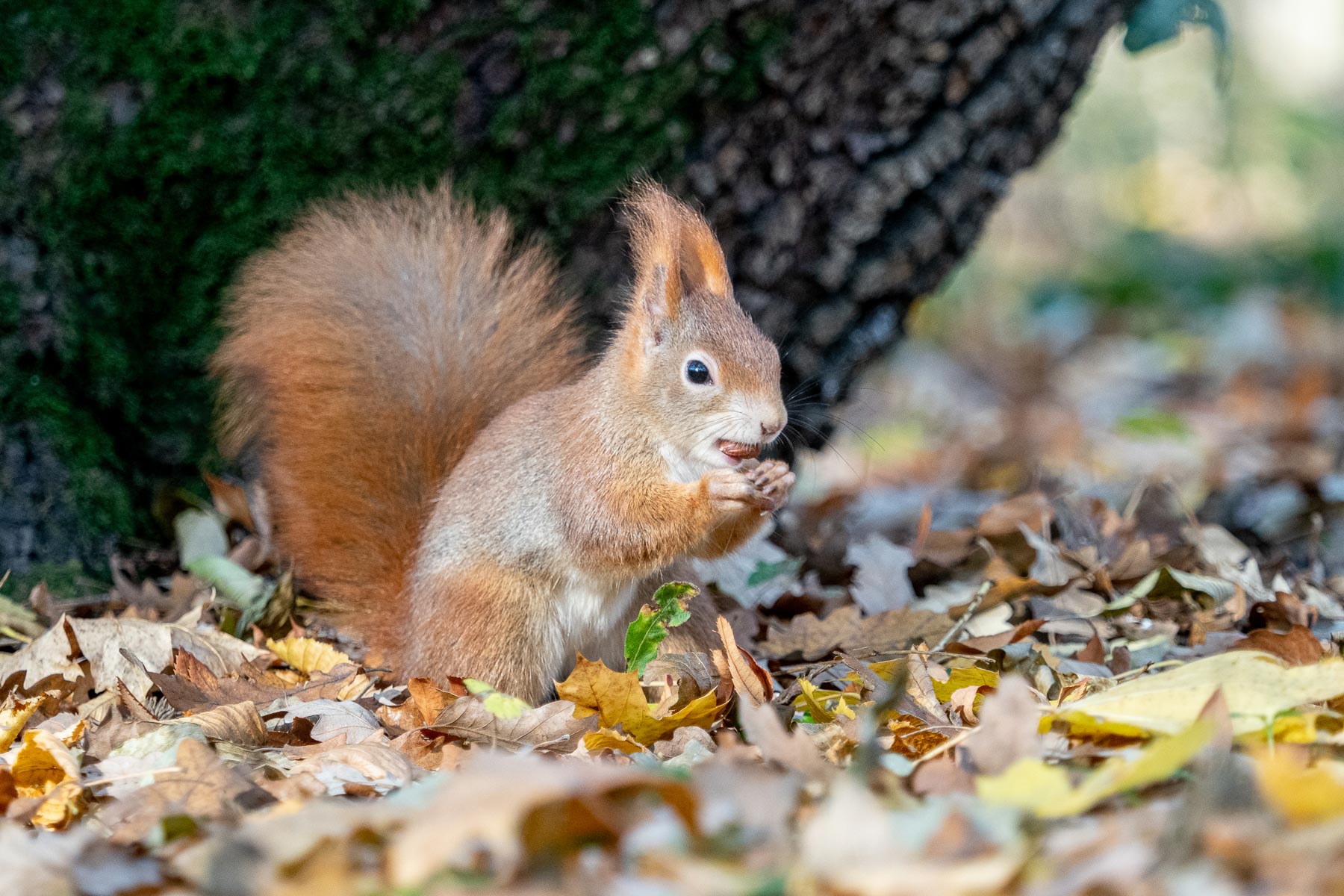 Eichkätzchen gehören zu den bekanntesten wildlebenden Säugetieren unserer Heimat. Als Baumbewohner sind sie sehr geschickte Kletterer und können sogar kopfüber an einem Stamm hinunterlaufen. Beim Klettern und Springen dient ihnen ihr großer und buschiger Schwanz als Balancierstange. Sie sind überwiegend tagaktiv, ernähren sich vor allem von Nüssen, Samen, Früchten und anderen Pflanzenteilen und kommen nur auf den Boden zur Nahrungssuche und genau das ist unsere Chance.