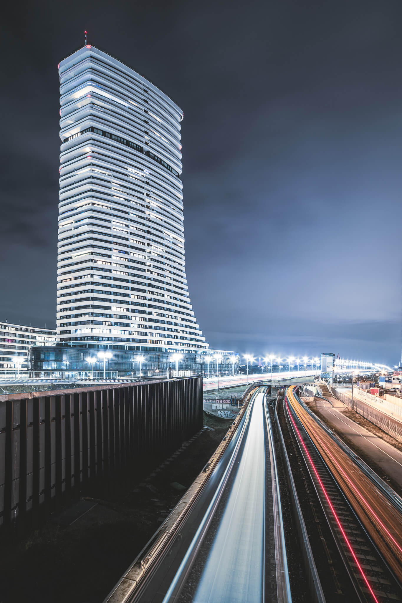 - UNO-City Blick über die U1 Kaisermühlen: Mein persönlicher Favorit: Direkt über der U-Bahn-Station entsteht ein perfekter Spot für Langzeitbelichtungen der Züge, kombiniert mit den Hochhäusern im Hintergrund - dynamische, geschwungene Lichtlinien inklusive.