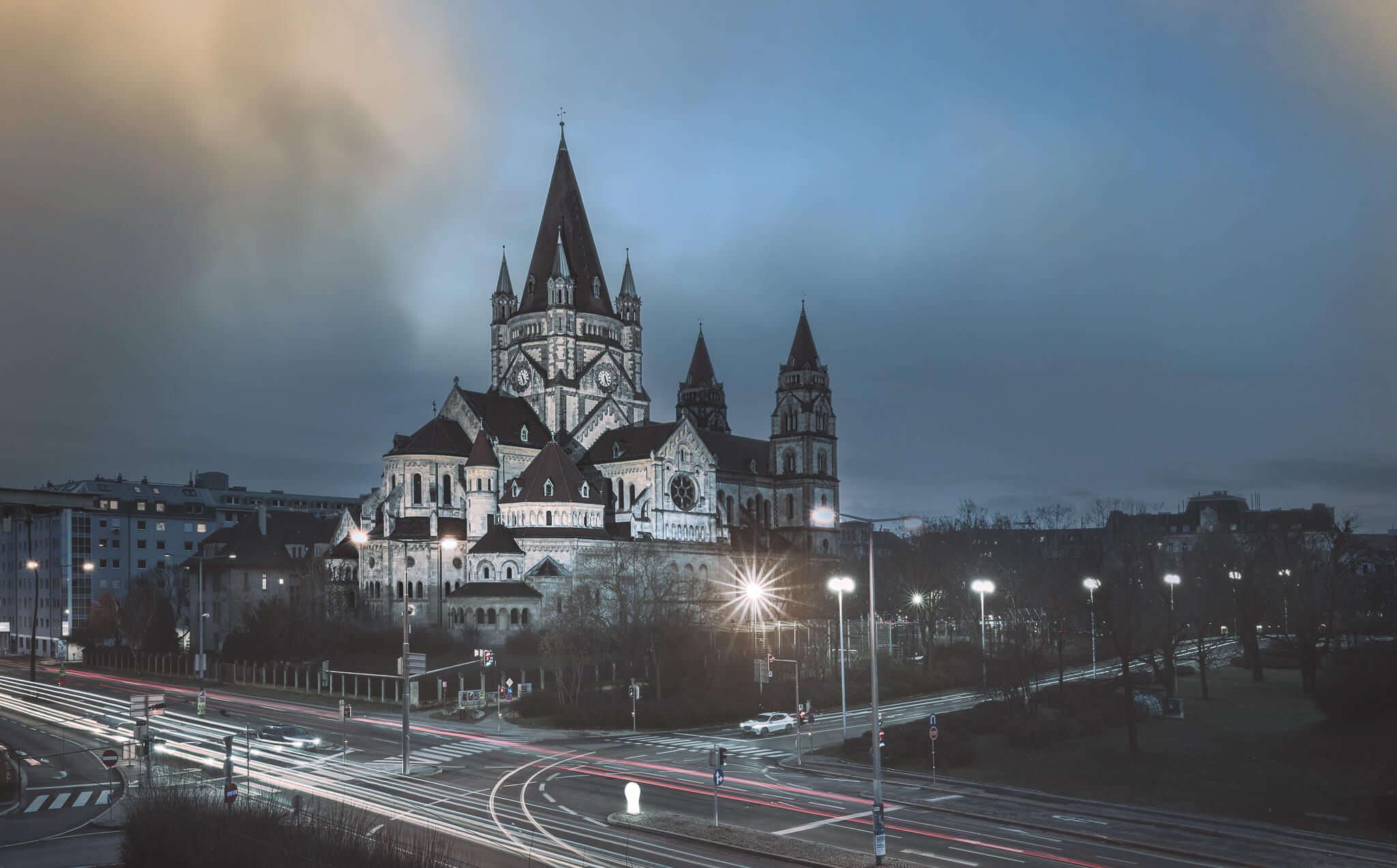 Von dort aus widmen wir uns auch gleich der Kaiserjubiläumskirche, die mit ihrer historischen Architektur einen faszinierenden Kontrast zu den futuristischen Hochhäusern bildet - ein perfektes Motiv für spannende Bildkompositionen.