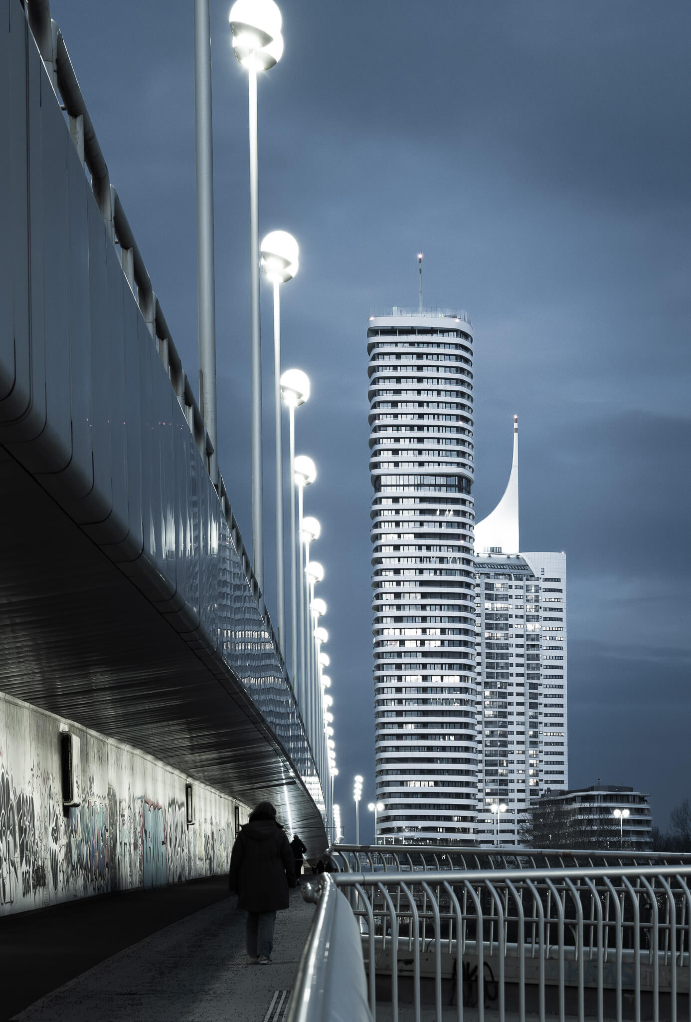 Anschließend überqueren wir die Reichsbrücke und erreichen die Donauinsel, von wo aus sich ein außergewöhnlicher Blick auf die Texturen und Strukturen des DC Towers eröffnet.
